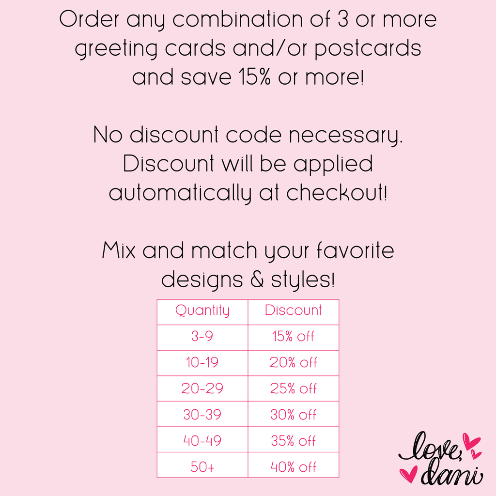Create your own bundle! Save 15% or more when you order any combination of at least three greeting cards and/or postcards. The more you buy, the greater the savings! No discount code necessary - discount will be applied automatically at checkout!